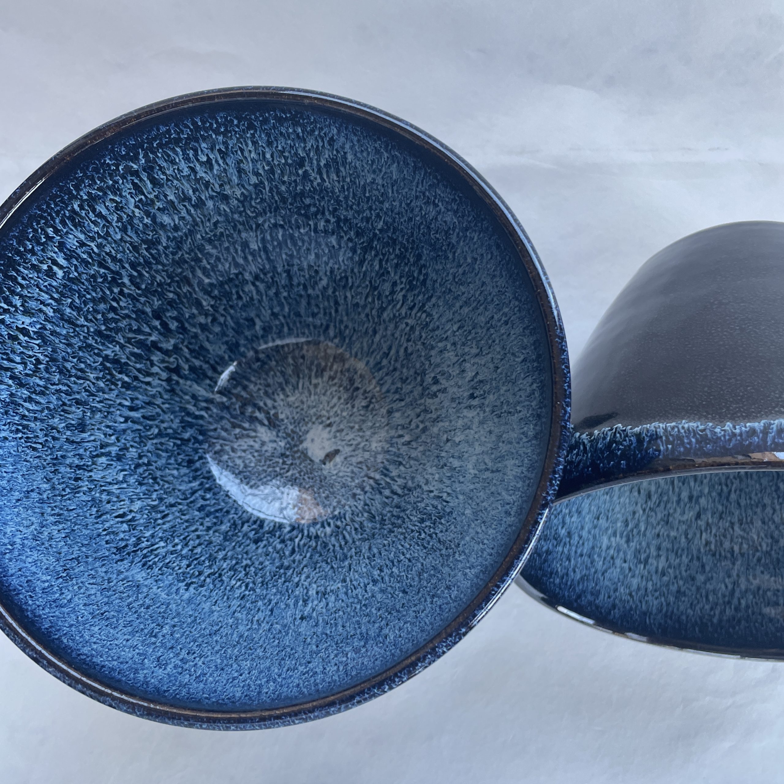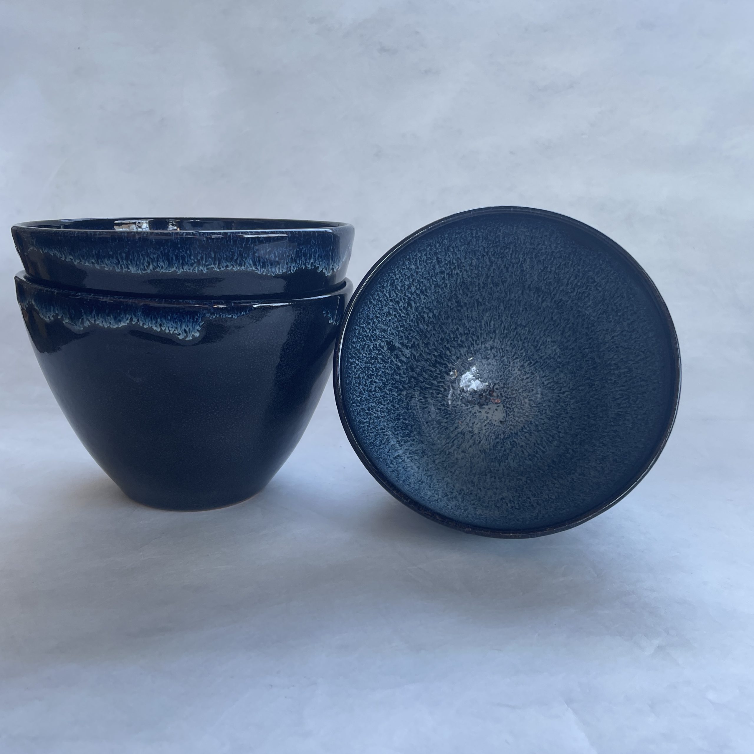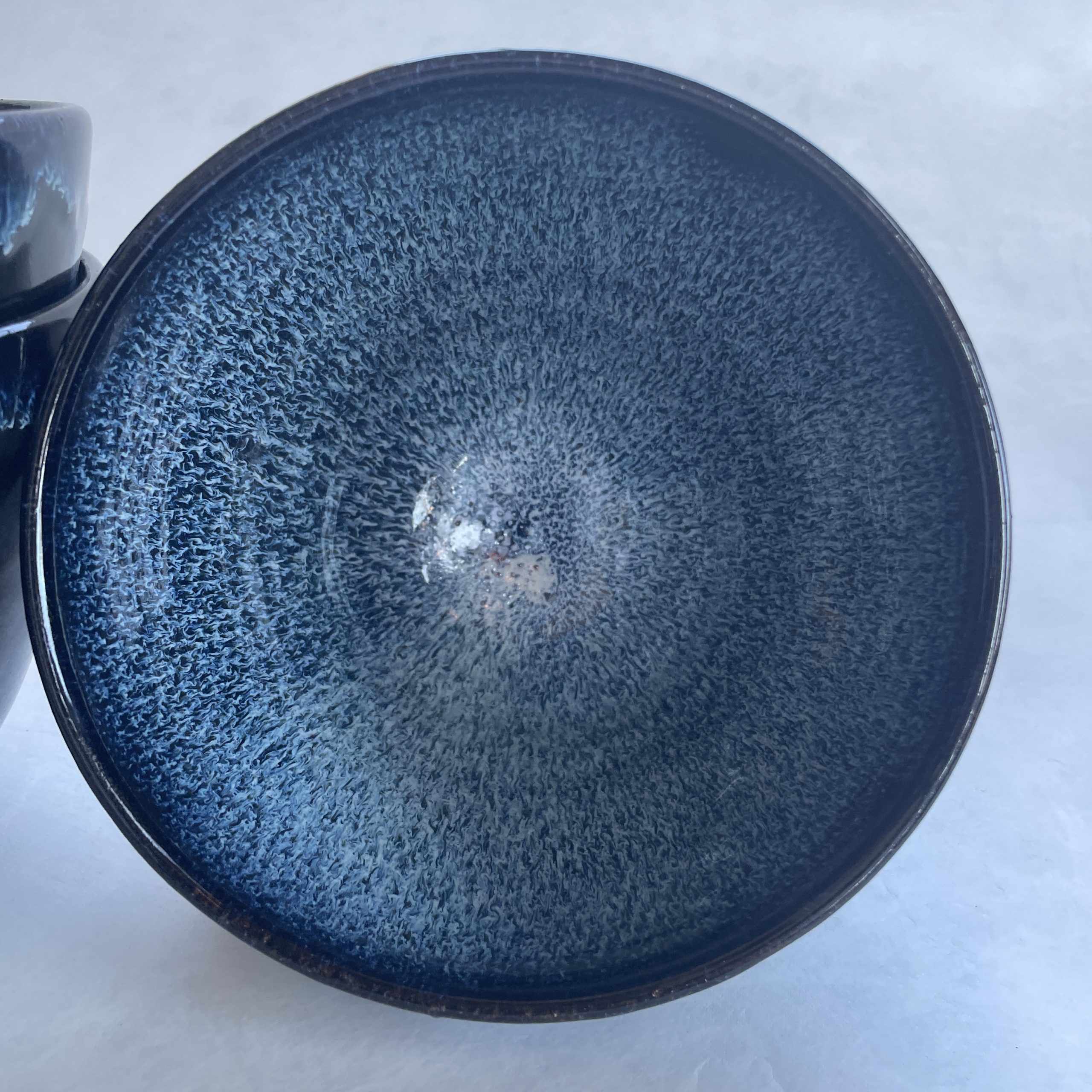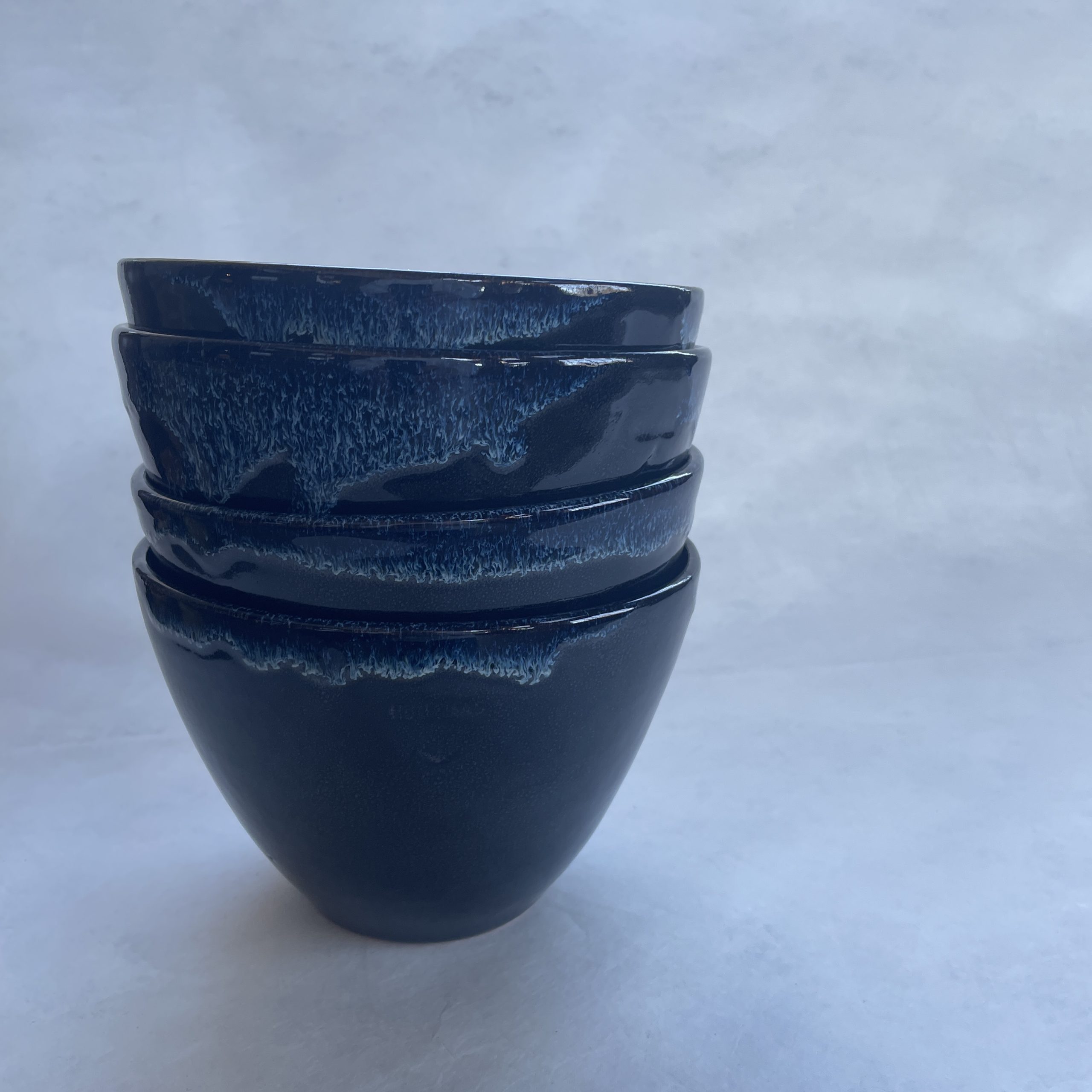 Denna skål kallar vi Höganäs, den är svart på utsidan med blåvit glasyr på insidan, blue rutile. Varje skål är unik i glasyren, men alla är fantastiska och väldigt vackra. På utsidan av skålen blir det rinningar av den blåvita glasyren som skapar livfullt mönster på det svarta.